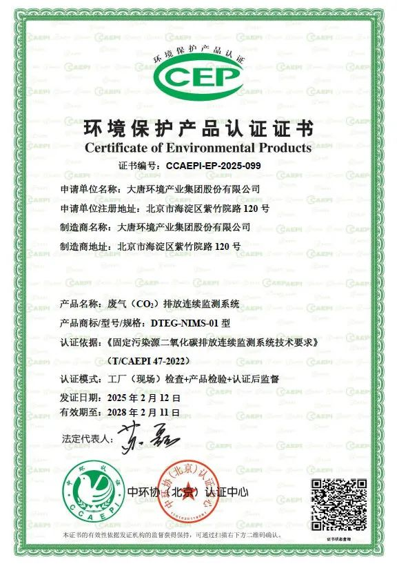 2月12日,大唐环境自主研发的二氧化碳排放连续监测系统成功获得中国环境保护产品认证(CCEP)证书,成为集团公司内首家通过该认证的企业。这一里程碑式的成就不仅彰显了大唐环境在环保技术领域的领先地位,更为国家“双碳”战略的实施注入了强劲动力。