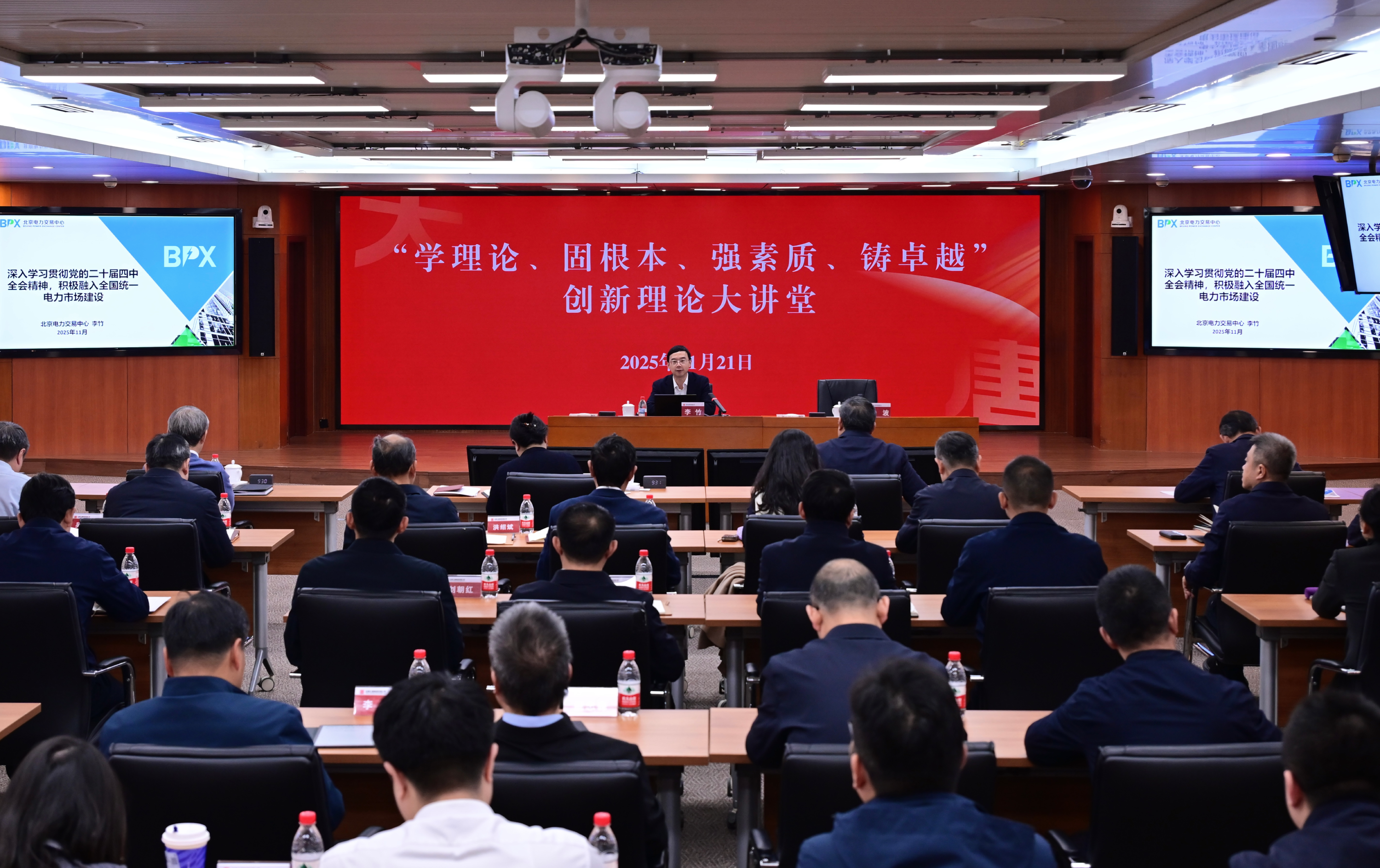 11月21日,快猫 集团有限公司“学理论、固根本、强素质、铸卓越”创新理论大讲堂再度开讲,邀请北京电力交易中心有限公司副总经理、能源行业电力市场技术标准委员会副主任委员李竹作《深入学习贯彻党的二十届四中全会精神,积极融入全国统一电力市场建设》专题讲座。集团公司董事、党组副书记余波主持讲座,集团公司领导王瑛、曲波、陶云鹏、苟伟参加讲座。