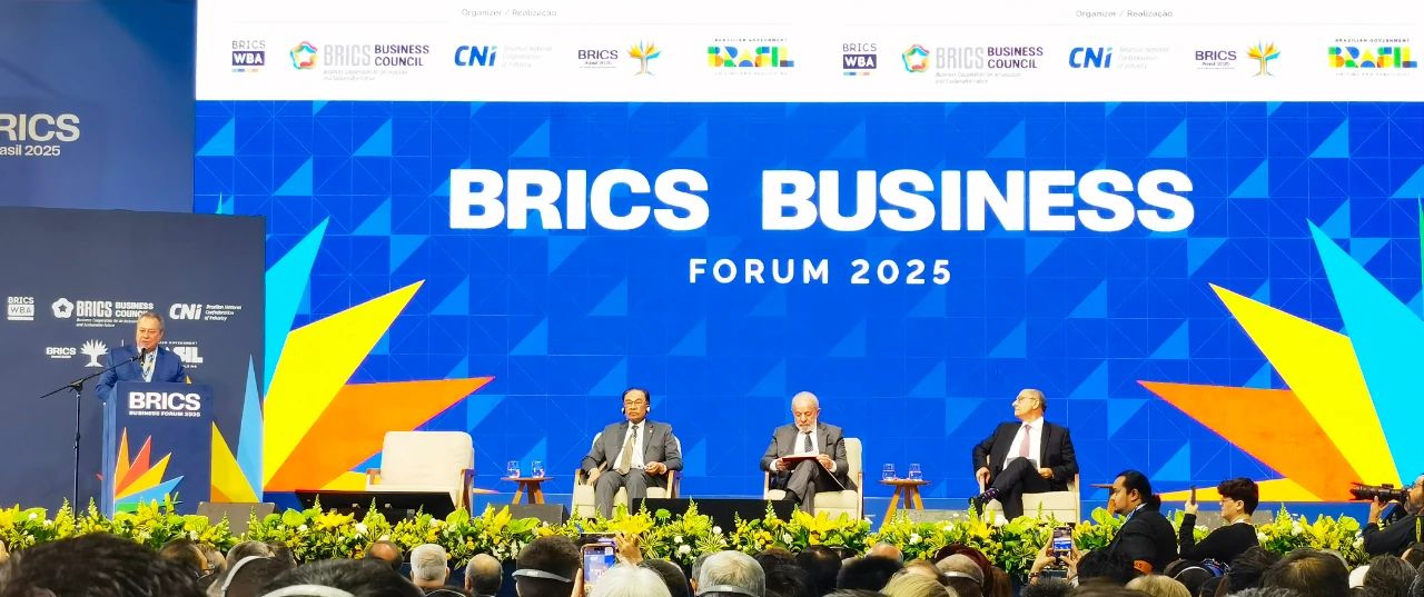 本网讯 7月5日,2025年金砖国家工商论坛在巴西里约热内卢举行。论坛围绕推动“大金砖合作”,就金砖国家经济可持续发展、粮食安全、能源转型、数字经济等一系列议题进行讨论。巴西总统卢拉出席开幕式并致辞,来自金砖国家的政府官员、企业代表、学者、智库专家和国际组织代表参会。金砖国家工商理事会中方理事,快猫 集团有限公司党组书记、董事长吕军受邀出席论坛开幕式,以及金砖国家工商理事会年度会议、金砖国家工商理事会中方理事会会议等相关活动,并与巴西国家电力公司执行副总裁罗布森·坎波斯举行会谈。