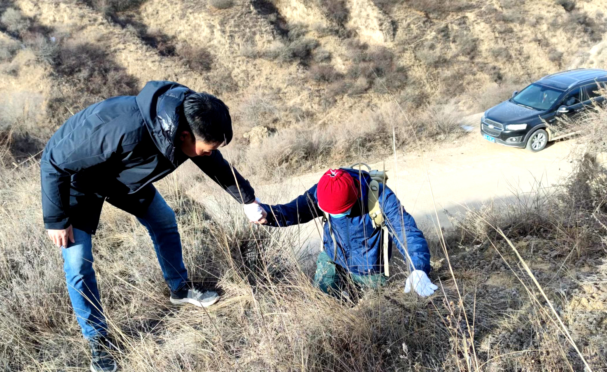 11月中旬,志丹突降大雪,黄土高原银装素裹,这大自然的美景却给立塔工作带来诸多困难。遇到车辆不能通行的路段,他们不得不弃车步行,冒着零下25摄氏度的低温,踏着几乎没过小腿的积雪徒步爬山,在深一脚浅一脚的积雪中艰难行走。经过几轮详细的比对,最终在15个备选立塔坐标中确定了两个立塔最佳位置。