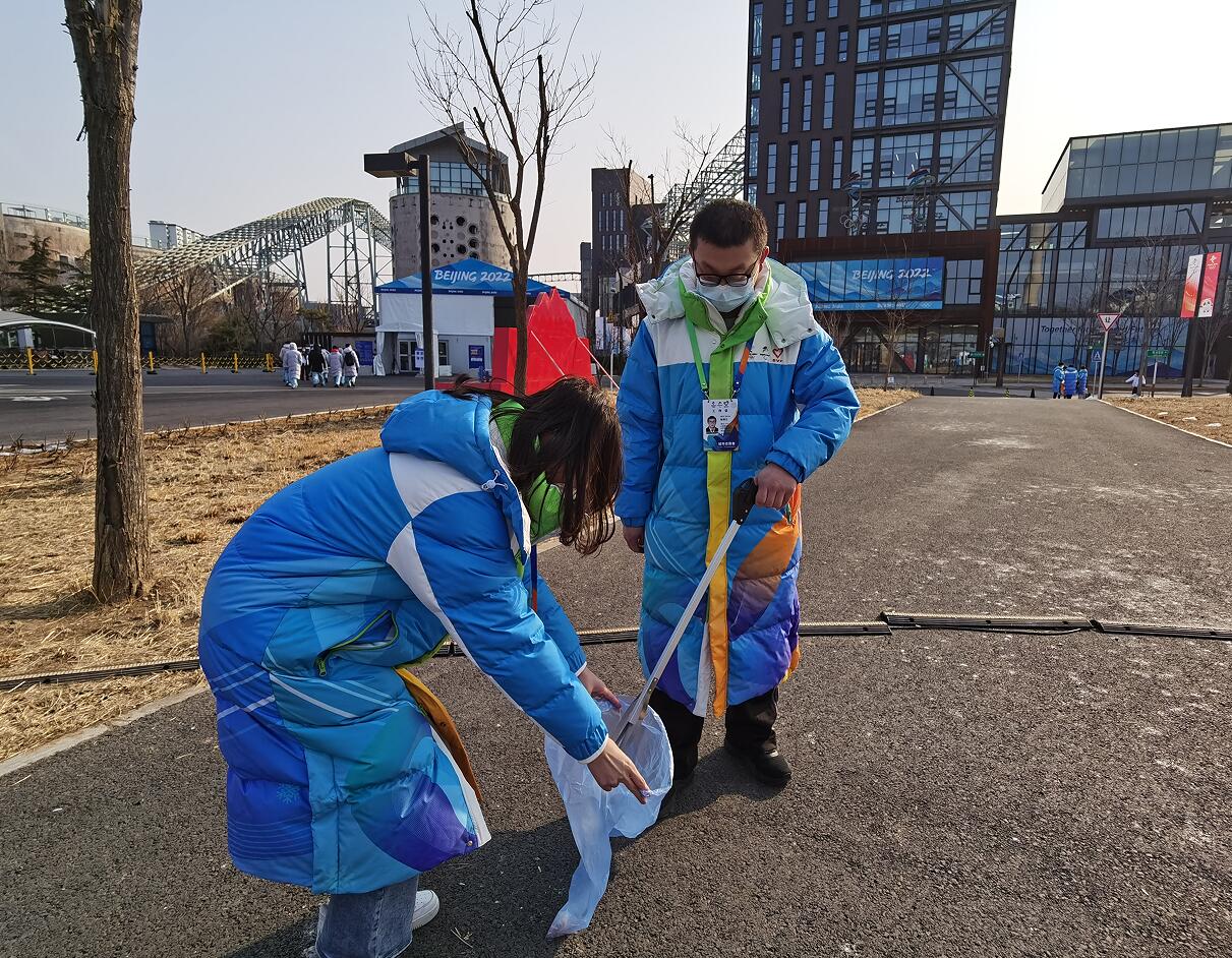 张睿娟与侯博文在冬奥组委总部附近拾捡垃圾,共同维护美好环境